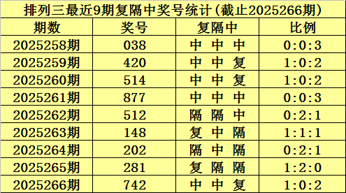 上期记忆:陈设三第2025266期奖号为:742。大小比为1:2,奇偶比为1:2,012路比为0:2:1。